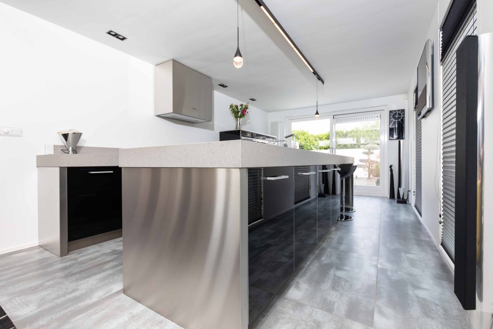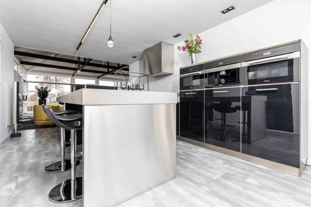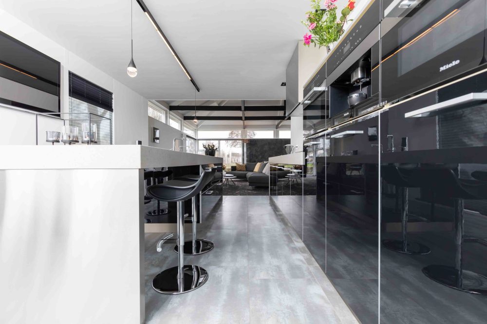 In de uitbouw is de oogstrelende designkeuken gesitueerd.