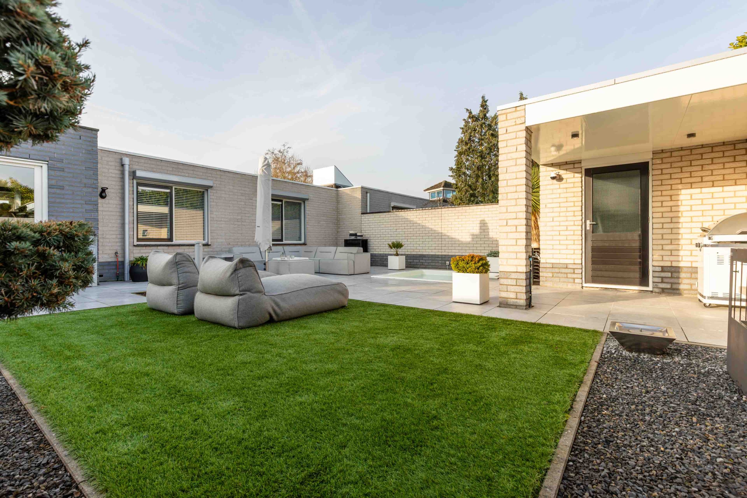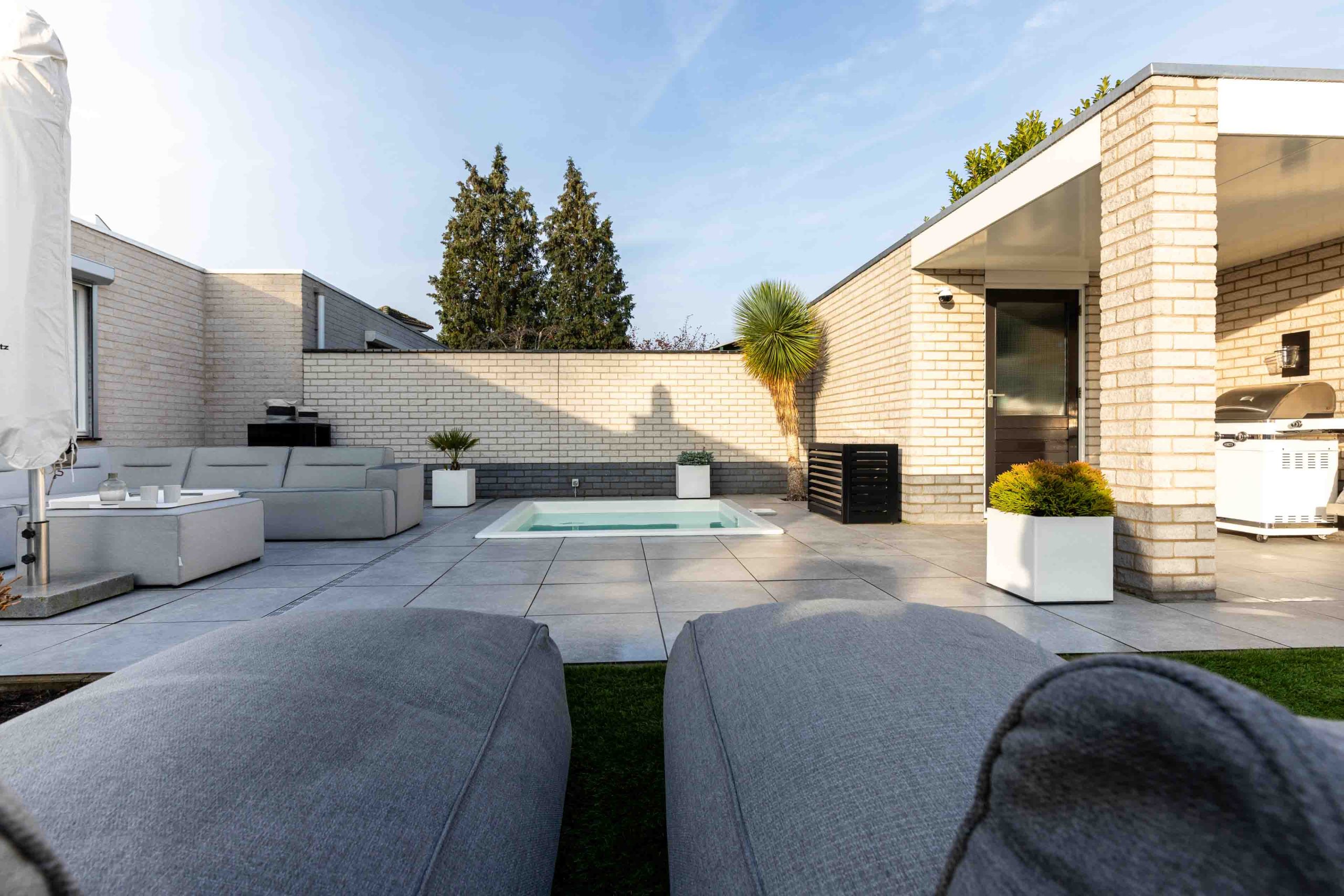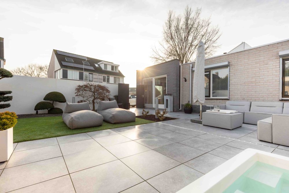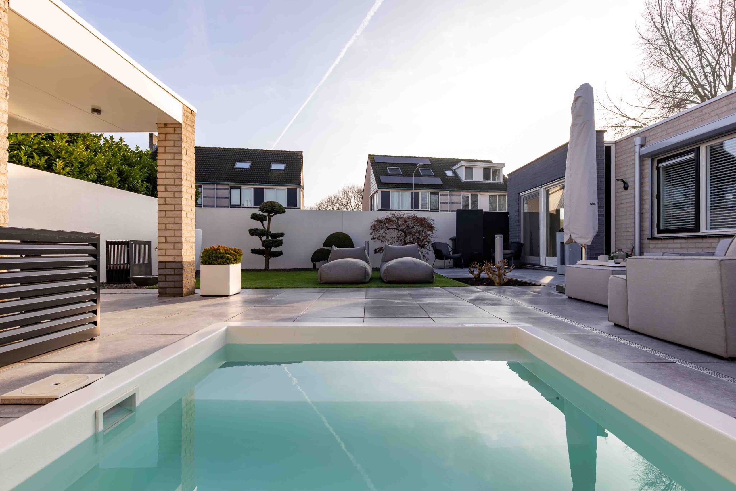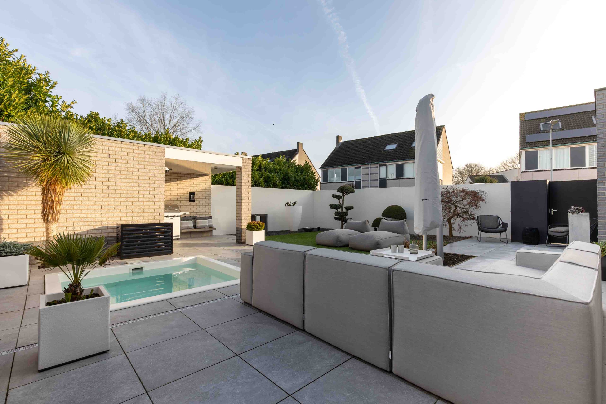 Doordachte terrassen met zowel zon en schaduw plekken en vooral onderhoudsvriendelijk. Minimale beplanting in oriëntaals sfeer. De Cooling Pool is niet alleen een eyecatcher maar ook een absolute verademing op zomerse dagen. Op vakantie hoef je niet meer want hét vakantiegevoel is al Thuis!
