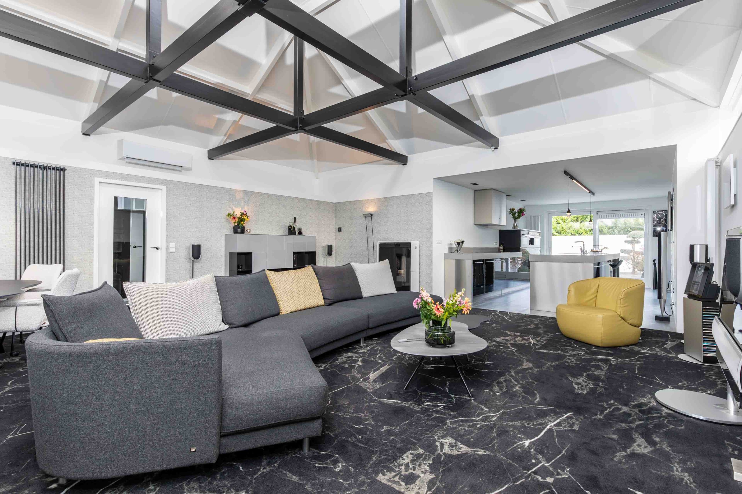 Neem plaats bij de super strakke pelletkachel, of schuif de pui open naar de tuin.