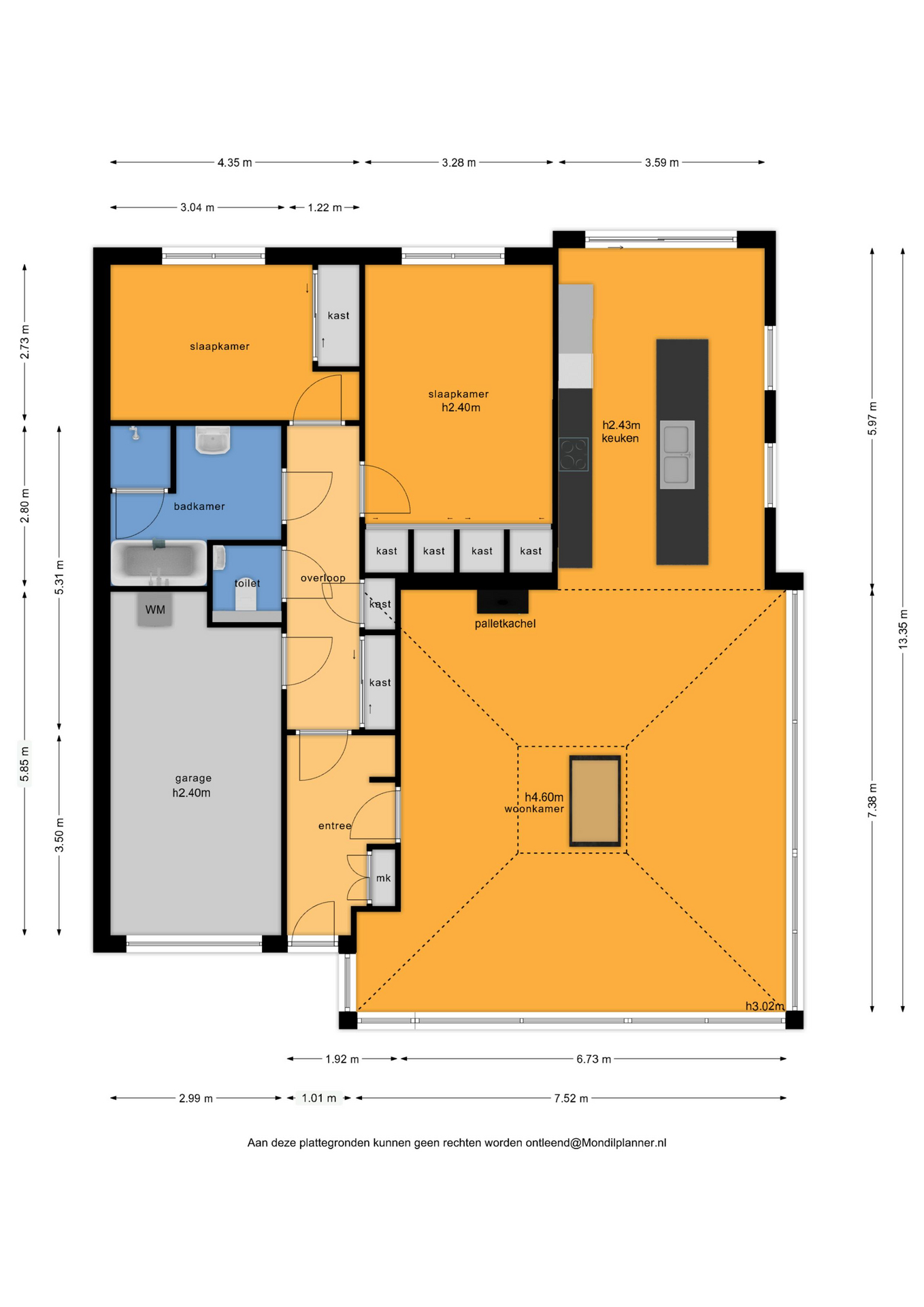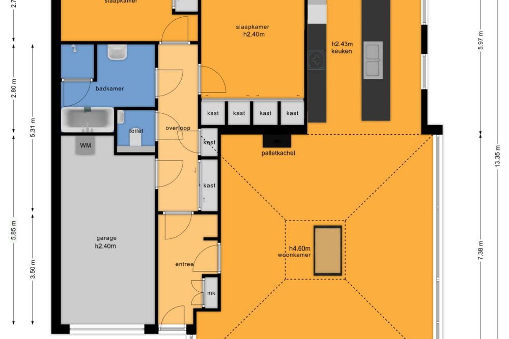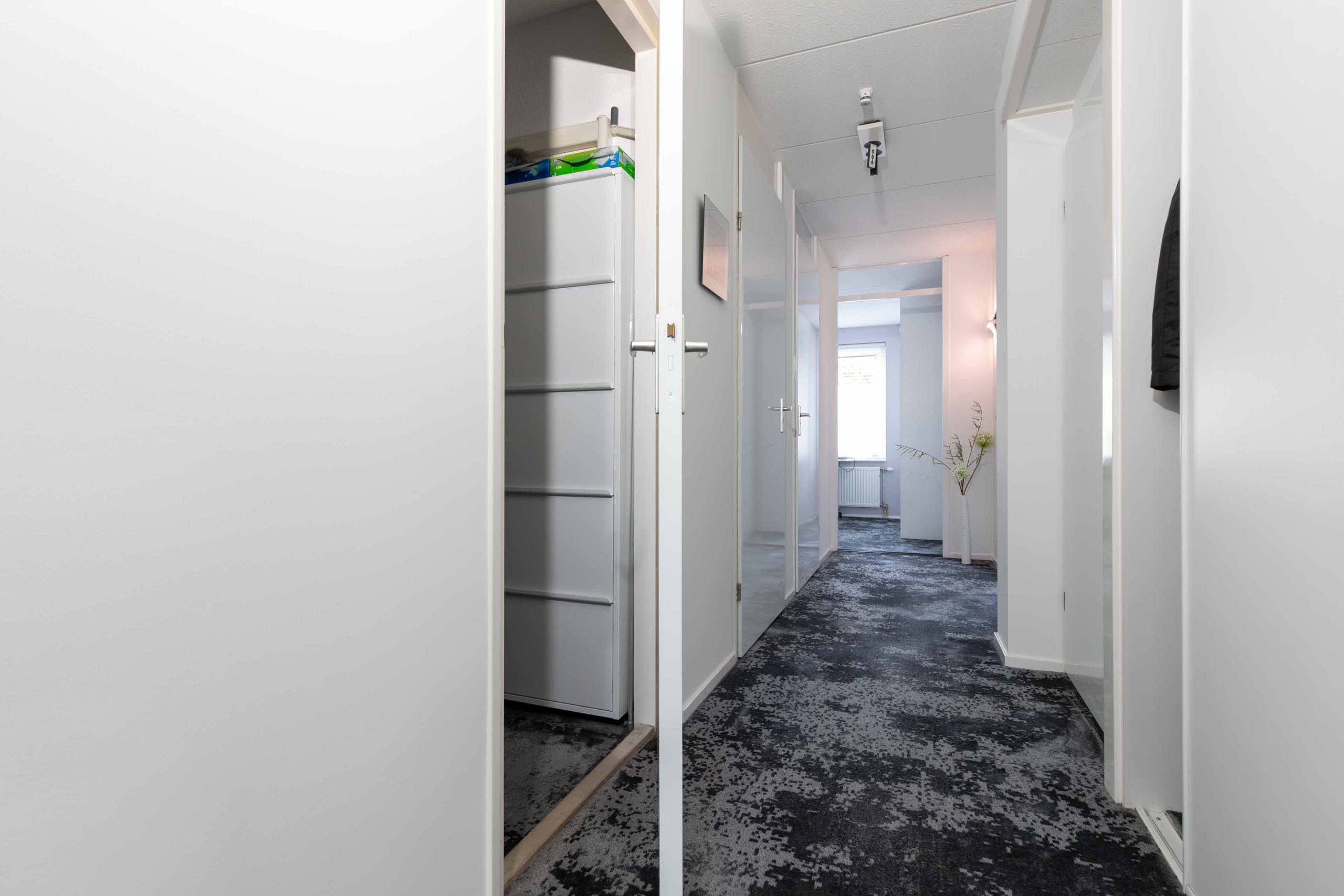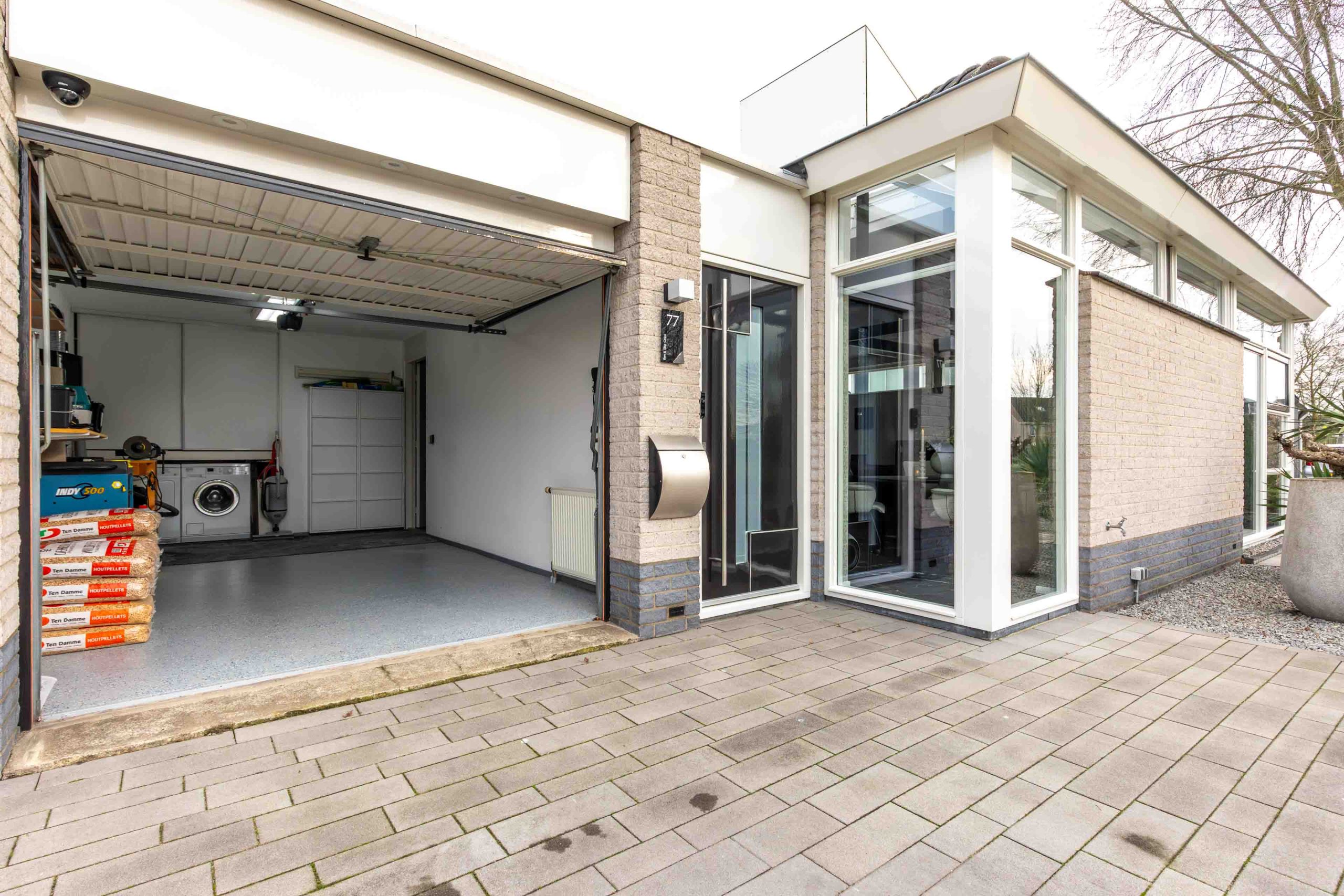 De lange gang voorziet verder in een prachtige wandschilderring, een garderobe en bergruimte. Ook geeft deze toegang tot de garage alwaar onder andere de witgoedapparatuur staat opgesteld en waar zowel een auto als fietsen ruimschoots onderdak vinden.