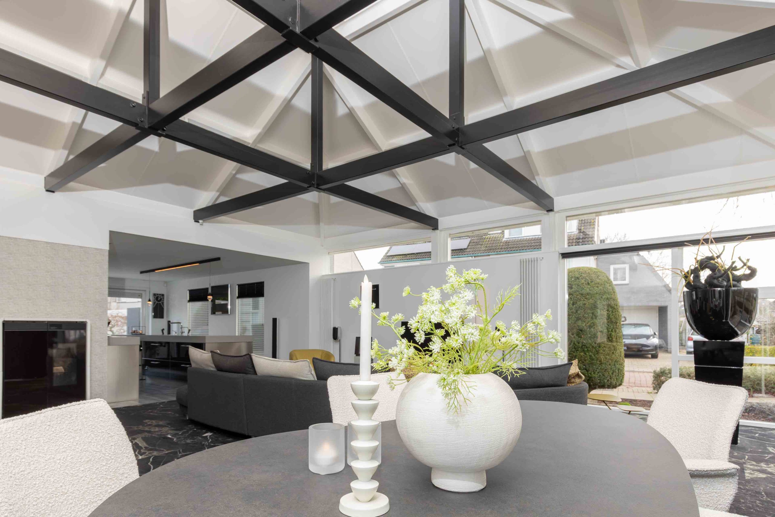 De grote raampartijen en lichtkoepel zorgen voor een zee van daglicht en bieden aan alle kanten zicht op de prachtige woonomgeving. Zelfs het buitengebied is zichtbaar.