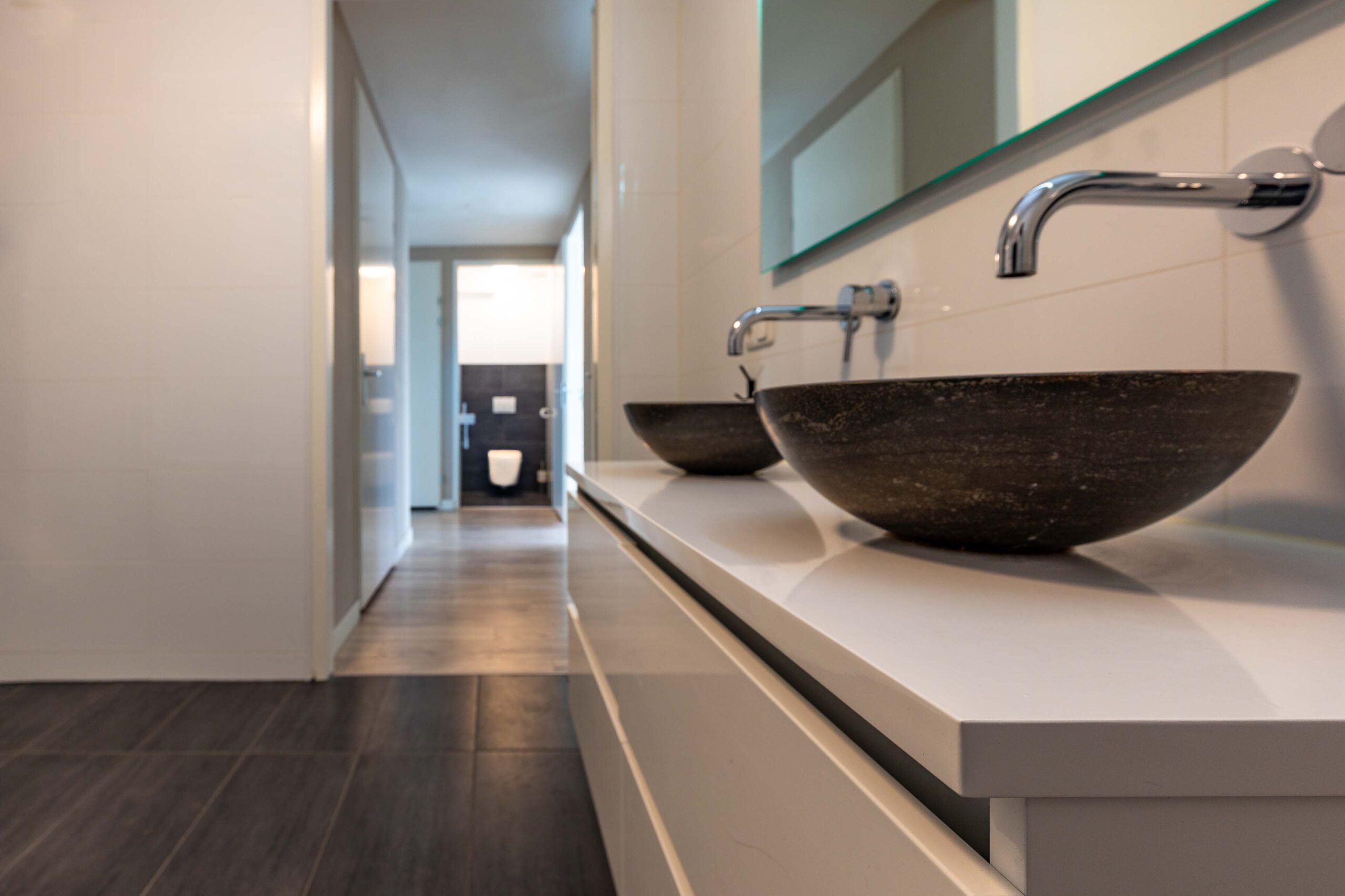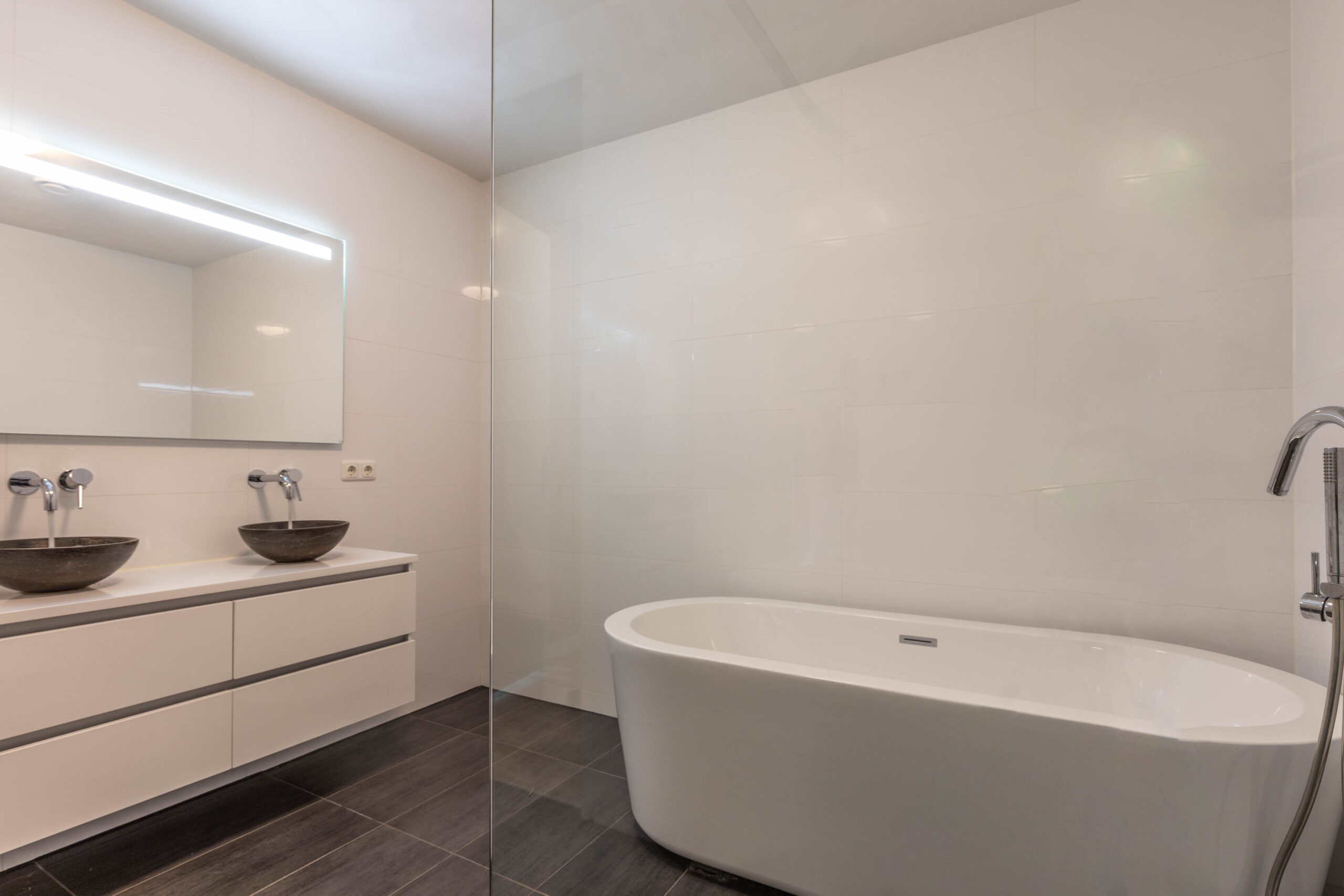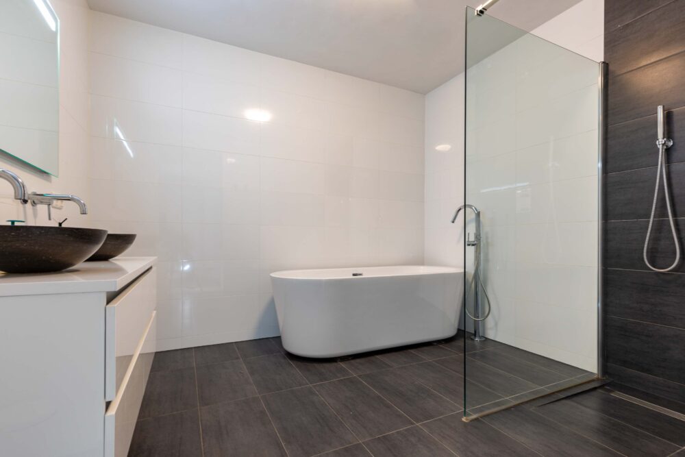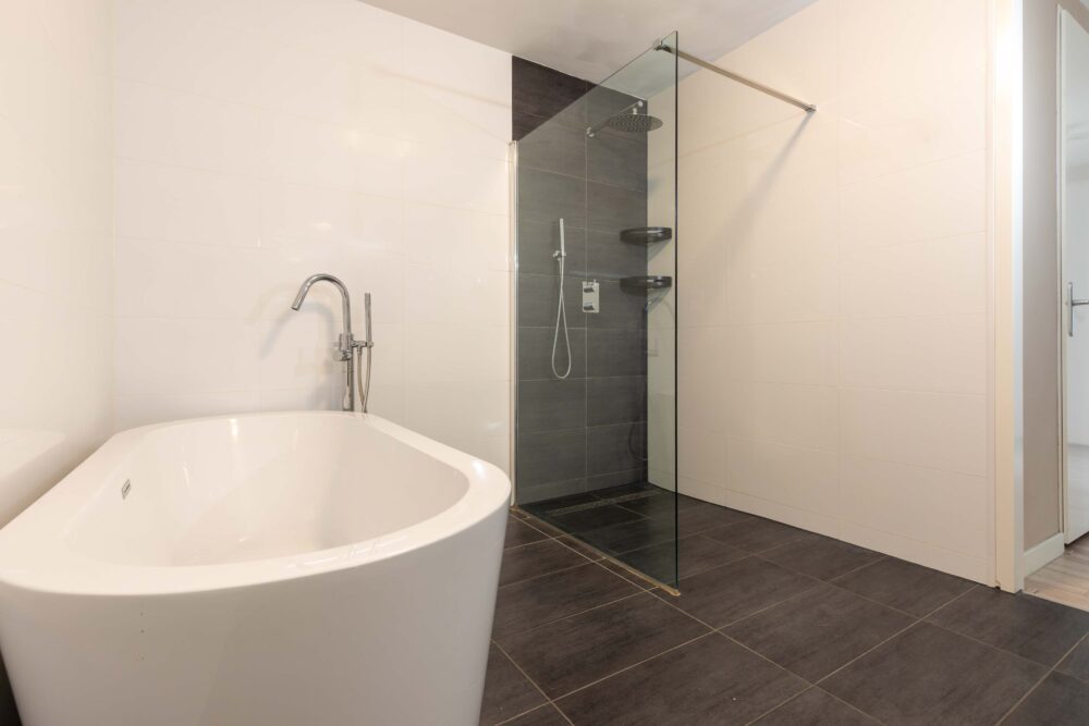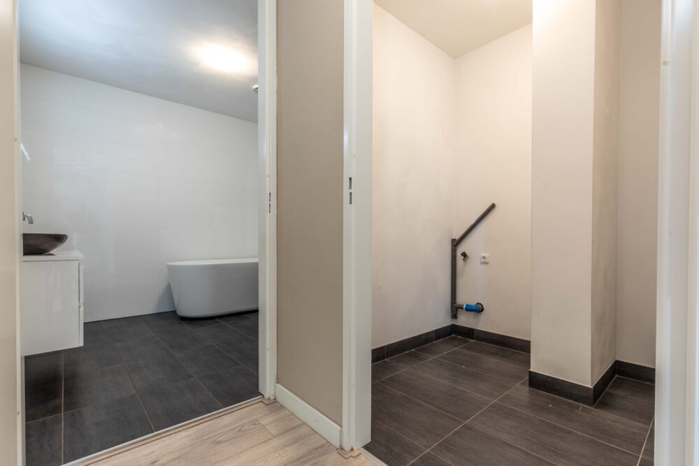 Naast de slaapkamers bevindt zich de keurige badkamer, die voorziet in een ligbad, ruime inloopdouche met regendouche, duo badkamermeubel met hippe waskommen en muurkranen.